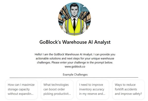 GoBlock's Warehouse AI Analyst is a CustomGPT that has been trained across 18 areas of warehouse operations and technology, built on hundreds of business cases, and backed by 30 years of GoBlock’s experience.