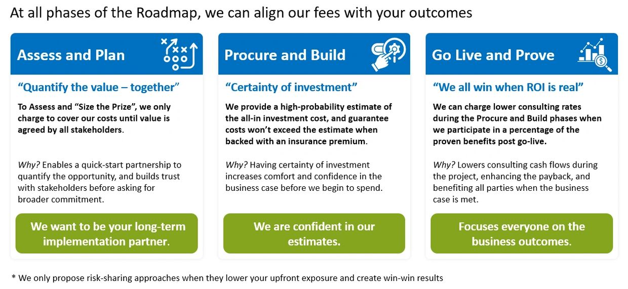 By sharing risk — whether sizing the opportunity, locking in investment certainty, or tying our success to post–go-live benefits — we give you confidence that every step leads to measurable ROI.